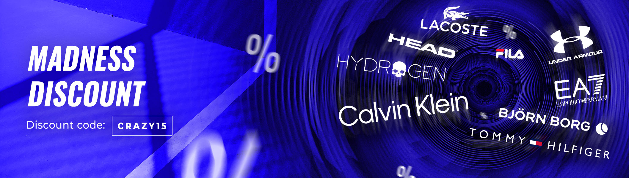 Use special discount code on clothing Lacoste, Fila, Bjorn Borg, Hydrogen, EA7, Calvin Klein, Tommy Hilfiger, Head and Under Armour products.