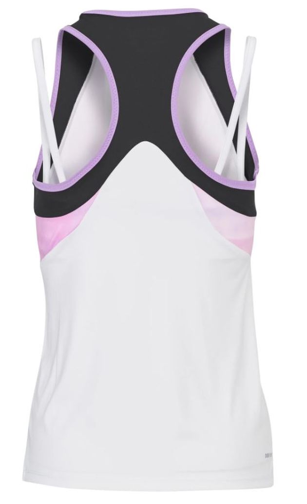 Stylowy top o dopasowanym kroju i ciekawym motywie graficznym. Elastyczne ramiączka zapewniają komfort gry. Delikatnie rozciągliwy, gładki poliestrowy materiał dobrze dostosowuje się do ruchów zawodniczki. W komplecie z dołączonym sportowym biustonoszem. Zastosowano odpowiadającą za odprowadzanie wilgoci i szybkie schnięcie technologię Deep Dry Tech.